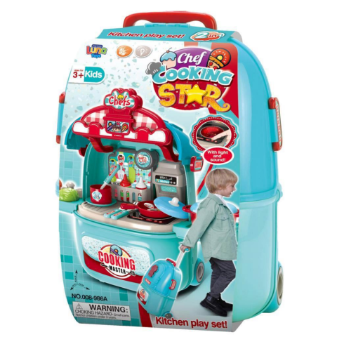 Ebben a kiváló minőségű műanyagból készült konyhai játékszettben minden kis séf megtalálja a számára szükséges eszközöket! A készlet egy kék színű, összecsukható bőröndben található, amely könnyedén hordozható, így a játék bárhová magatokkal vihető, legyen szó akár egy baráti látogatásról vagy egy családi kirándulásról.