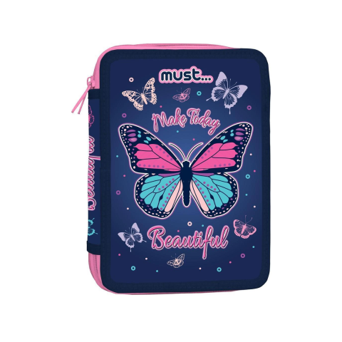 Ez a csodálatos pillangós kihajtható tolltartó nemcsak praktikus, hanem inspiráló is, tökéletes kiegészítője minden diák iskolatáskájának! A sötétkék háttérrel és a "Must... Make Today Beautiful" felirattal ellátott dizájn szemet gyönyörködtető, miközben a rózsaszín és türkizkék pillangók látványosan kiemelkednek, így biztosan mindenki kedvence lesz.