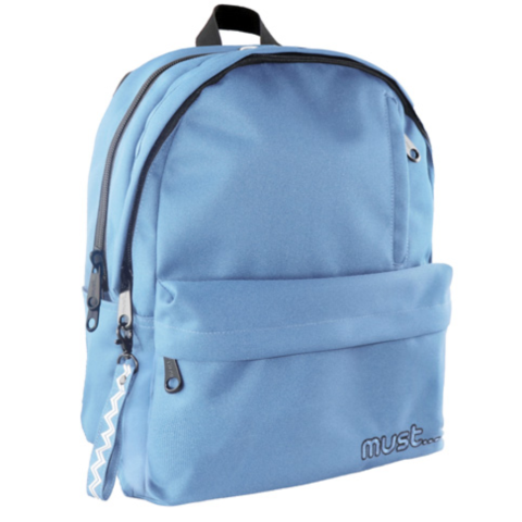 Must: Világoskék négy rekeszes lekerekített iskolatáska, hátizsák 32x19x42cm