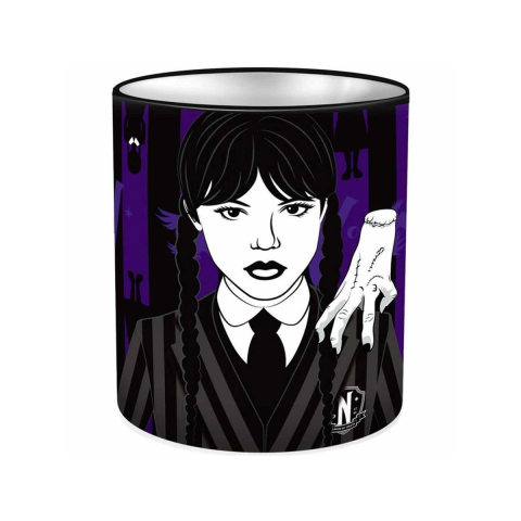 Hozd el az Addams család különleges hangulatát az íróasztalodra a Wednesday henger alakú fém írószertartóval! Ez a sötét és stílusos írószertartó tökéletes választás minden Wednesday rajongónak, akik szeretik a gothikus dizájnt és a különleges karaktereket. A fekete és lila színek kombinációja, valamint a jellegzetes Wednesday képével díszít