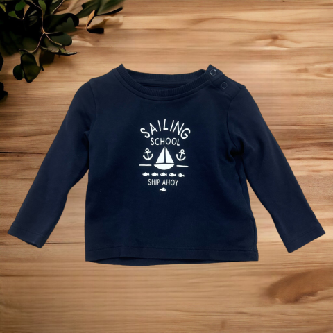 Sötétkék, kishajós felső Egyenes szabású, kerek nyakkivágású, vállnál patentos. Kellemes pamut anyag. Hibátlan állapotú.