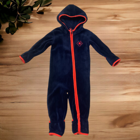 Vastag plüss rugdalózó Puha plüss anyag, kapucnis, kéz és láb ráhajtókával, eleje cipzáros. Ideális viselet, az őszi sétákhoz. Hibátlan állapotú.