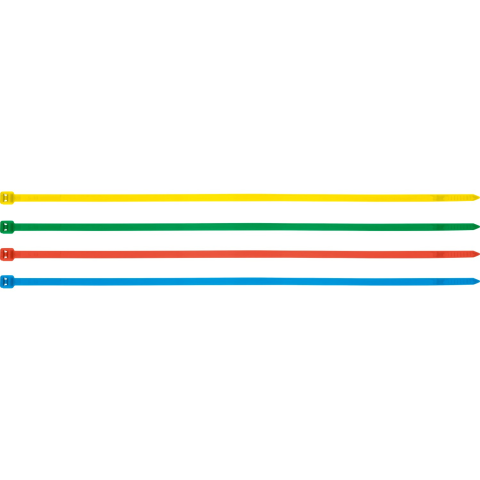 Sokoldalúan használható kábelkötegelők erős nylonból. 100 darabos gazdaságos csomag, kék, sárga, zöld és piros színek vegyesen. A kábelkötegelők mérete 300 m x 4,2 mm (h x sz).