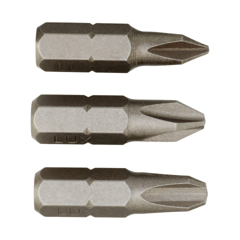 A LUX TOOLS bitkészlet 3 masszív, szabványos bitet tartalmaz barkácsolók számára. A bitek 25 mm hosszúak, PZ-kereszthornyú csavarokhoz használható. 6,3 mm-es (1/4 ") bittartókhoz illeszkedik. A csomagolás 1-1 db PZ bitet tartalmaz a következő méretekben: PH1, PH2 és PH3.