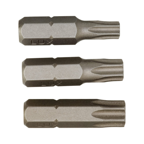 A LUX TOOLS bitkészlet 3 db masszív, szabványos bitet tartalmaz barkácsolók számára. A bitek 25 mm hosszúak és belső hatszög nyílású csavarokhoz használhatók. 6,3 mm-es (1/4 ") bittartókhoz illeszkedik. A csomagolás 1-1 db TX bitet tartalmaz a következő méretekben: TX25, TX30 és TX40.