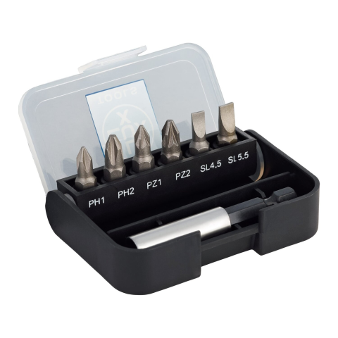 A LUX-TOOLS bitkészlet 6 erős standard csavarbehajtó bitet, valamint egy bittartót tartalmaz az ezermesterek számára. A csavarbehajtó bitek 25 mm hosszúak és TX-hatágú, csillag csavarokhoz alkalmasak. A csomagba 1 bittartó, és egy-egy alábbi bit tartozik: Egyhornyú: 0,6 mm x 4,5 mm és 0,8 mm x 5,5 mm / Philips: PH1 és PH2 / PZ-kereszthornyú: PZ1 és PZ2.