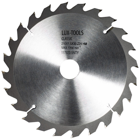 A kézi körfűrészekhez használható, 210 mm átmérőjű és 30 mm-es furattal rendelkező LUX-TOOLS keményfém körfűrészlap ideális puha-, kemény- és egzotikus fák (az erezettel párhuzamosan és arra merőlegesen végzett), valamint rétegelt lemezek, furnérok, asztaloslemezek, gipszkarton és tömörfa lapok fűrészeléséhez. Az ellenálló fűrészlap 24 darab keményfém foggal rendelkezik.
