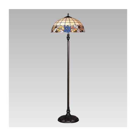 A Tiffany állólámpa, virágos mintázattal, 153 cm magassággal, a Prezent 145 modell, melyet Luxera gyárt. A lámpatest klasszikus tiffany stílusban készült, üveg és fém anyagok felhasználásával, barna, bézs, antikolt és színes színvilággal. Két darab E27 fo