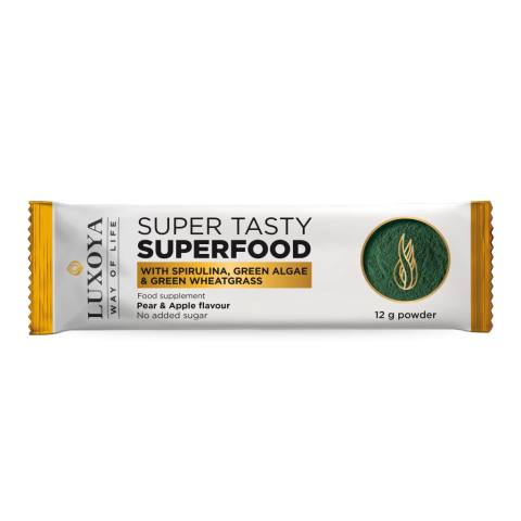 Luxoya Super Tasty Superfood - körte-alma ízesítésű spirulinát, zöld algát és zöld búzafüvet tartalmazó étrend-kiegészítő italpor 12 g. A SUPER TASTY SUPERFOOD with SPIRULINA, GREEN ALGAE & GREEN WHEATGRASS termékünk egyedi módon kombinálja a spirulinát a