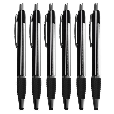 Toll - egy klippel, cserélhető újratöltőanyag fekete és kék színben, visszahúzható jegyzettömb (húzható fülekkel), ABS anyag, vas, alumínium, papír és szilikon, TPR tippek, érintőképernyős eszközökkel való használatra, méretek 14,5 × 1,5 cm, 3 fekete toll és 3 kék toll utántöltővel