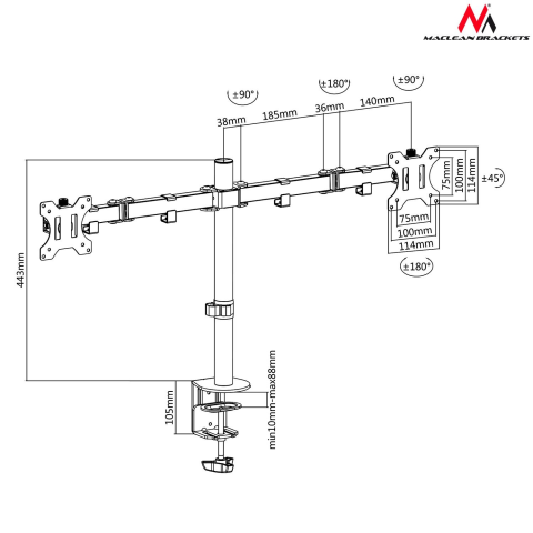 8 kg teherbírással rendelkező, forgatható, +/-45 °-ban dönthető asztali monitor állvány. Állítható magasság: max 44,3cm Karhossz: 39,9cm VESA: 75x75, 100x100 Forgatható: +/-180° Dönthető: +/-45° Teherbírás: 8kg