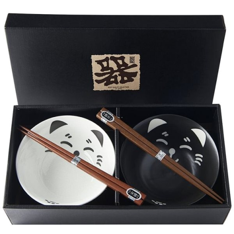 Tál készlet - 2 db + 2 pár evőpálcika, térfogata 500 ml, kézzel készült japán termék, átmérője 15 cm, magassága 7,5 cm, az evőpálcikák hossza 22,5 cm, anyaga kerámia és fa, mosogatógépben mosható, mikrohullámú sütőben használható A(z) Made In Japan Cat Face Design Tálkészlet pálcikákkal, 400 ml, 2 db tál szett legfontosabb jellemzői
