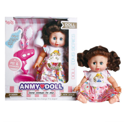 Barna hajú pisilős baba hajszárítóval, bilivel és kiegészítőkkel