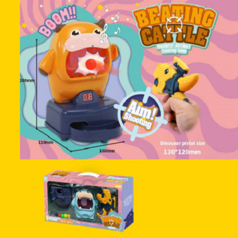 Ez a célba lövő játék garantáltan hatalmas sikert arat majd a kis srácok körében, hiszen semelyik eleme nem éppen szokványos. A fegyvert egy dinoszaurusz formájú pisztoly adja, míg a céltáblaként egy hatalmas tehén nyitott szája szolgál. A feladat egyszerű! Tedd a lövedéket a dinoszauruszos pisztolyba, kapcsold be a céltáblát, hogy a digitális kijelző helyetted