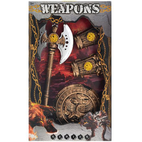 Egy részletgazdag kidolgozottsággal rendelkező középkori bárdot, pajzsot és kézfejvédőt szerezhetsz be gyermeked számára amelyek használatával egy igazi harcos bőrébe bújhat és felveheti a harcot az ellenséges katonákkal szemben. A készletben egy különleges, hatalmas karmokkal rendelkező kézfejvédő is megtalálható amely a közelharcban rendkívül haté