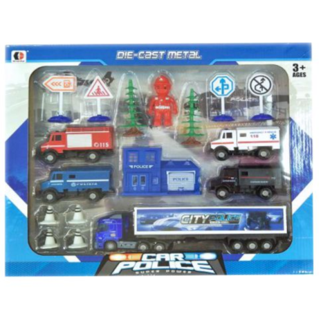 Ez a fantasztikus szett minden szükséges járművet tartalmaz az izgalmas játékhoz. A rendészeti- és mentőegységek közül az összes szervezet teherkocsijai felvonulnak és a készlet még egy rendőrségi épületet is tartalmaz. A kiegészítők közt megtalálható egy figura, bóják az útlezárásokhoz, táblák és még 2db fa is. A szett le