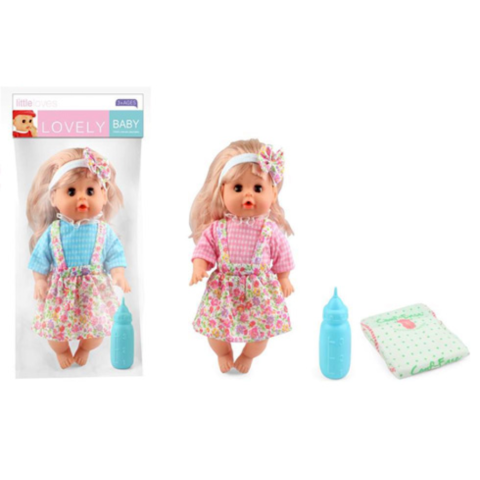 A játékbaba mozgatható végtagokkal rendelkezik, kiegészítőéi között megtalálható a cumisüveg és a pelenka is.