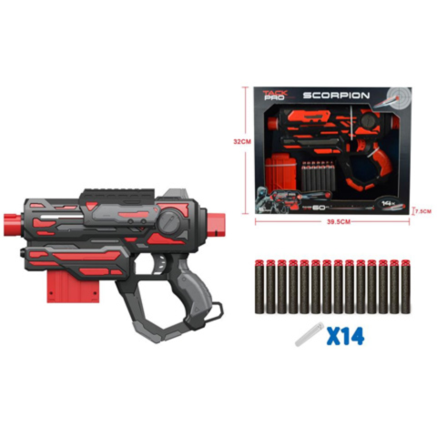 A szivacslövő fegyverek remek szórakozást és izgalmas kalandokat jelenthetnek a gyermekek számára. Ehhez most egy különleges Scorpion nevű szivacslövő fegyvert hoztunk el gyermeked számára, mely biztosan lenyeri majd gyermeked tetszését. A fegyver vagány megjelenést kapott, részletes kialakítással, mely piros és fekete színt kapott. A fegyverhez 14 db szi