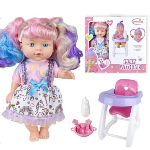 A gyerekek tetszését biztosan elnyeri majd ez a nagyon aranyos hajas baba szett, amelyhez még egy csodaszép unikornisos ruha, etetőszék , cumisüveg valamint etetőtál is tartozik. Hajának különleges , élénk színei igazán különlegessé teszik. Haja fésülhető, fonható valamint formázható is, végtagjai mozgathatók. A Magic Toys remek minőségű játékai közül rendkívül széles vála
