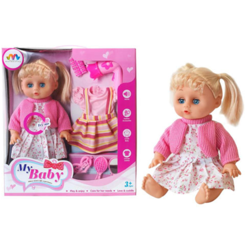 Szőke hajú baba hanggal, ruhával és kiegészítőkkel
