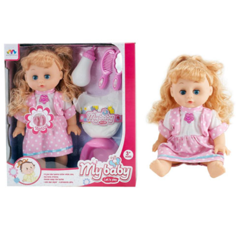 Világos barna hajú pisilős baba hanggal, bilivel és kiegészítőkkel