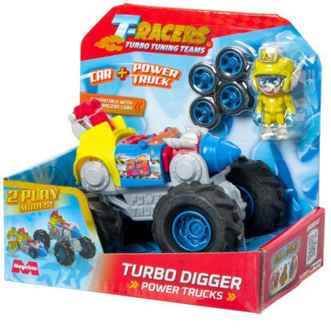 A T-Racer versenyeken sosem lehet tudni, milyen terepen zajlik majd a küzdelem, éppen ezért tökéletes választás ez az átalakítható Turbo Digger szuperterepjáró. Ha nagy a sár és a hegyre kell felkaptatni, Monster üzemmódban minden akadályt legyőz ez a járgány, az aszfalton viszont sokkal gyorsabb egy versenyautó. Csak egy egyszerű kerékcsere és némi átépítés szükséges a győzelemhez.A dobozban 1 darab versenyautó található, de izgalmasabb a játék, ha több já