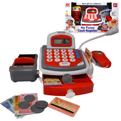 1 kép MagicToys Piros funkciós elektromos pénztárgép futószalaggal , termékekkel és hanggal