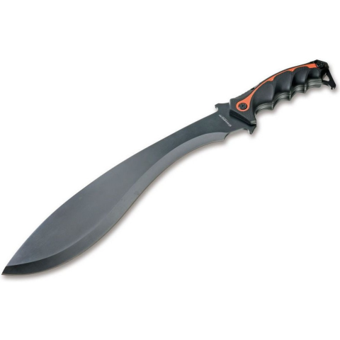 Bozótvágó kés ívelt pengével, gyöngyvászon tokkal A Magnum Chainsaw Backup Machete soha nem hagyná cserben tulajdonosát, még a trópusi esőerdőben sem. A masszív lapos felépítés és a négy csavarral rögzített gumírozott markolatrészek ezt a kést még szilárdabbá és tartósabbá teszik a szükségesnél. A penge hossza és vastagsága tökéletesen kiegyensúlyozott, a nyél pedig ergonomikus kialakítású, így fáradás nélkül dolgozhat. A penge megbízhatóan üt