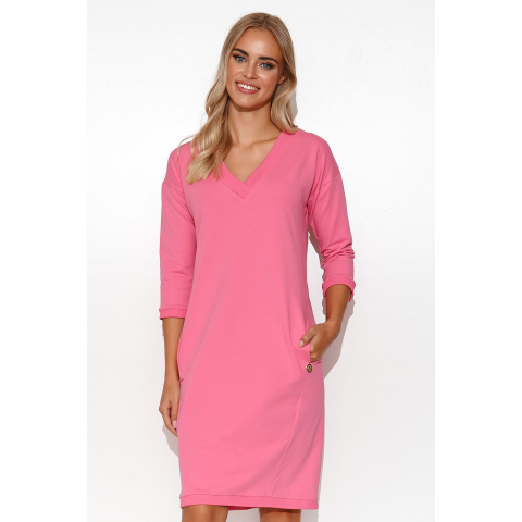 Hétköznapi Ruha Model 176198 Makadamia MM-176198. Színe: RózsaszínEgyszerű, alkalmi szabású tréningruha. Mély V-nyakú, 3/4-es ujjakkal és praktikus oldalzsebekkel rendelkezik. Az egyikre egy dekoratív aranylemez van varrva. A ruha bordázott szegélyekkel rendelkezik, amelyek sportos jelleget kölcsönöznek a ruhának. A ruha hátsó része sima, középen rejtett varrással. Tökéletes nyári választás, viseld könnyű edzőcipővel vagy s