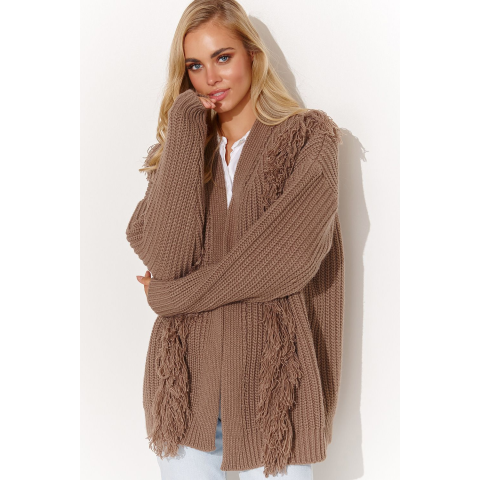 Női Kardigán Makadamia MM-184779. Színe: DrappA női gomb nélküli, nyitott pulóver egyedi darab a ruhatáradban. Hosszú ujjakkal és oldalt díszes bojtokkal rendelkezik, így karaktert és egyéni stílust kölcsönöz a stílusodnak. A pulóver hátoldalán egységes és szabályos minta található. A pulóverbe varrt arany flitterek további elegáns elemet jelentenek. Ez a pulóver ötvözi az alkalmi és az elegáns stílust. Remekül mutat egy
