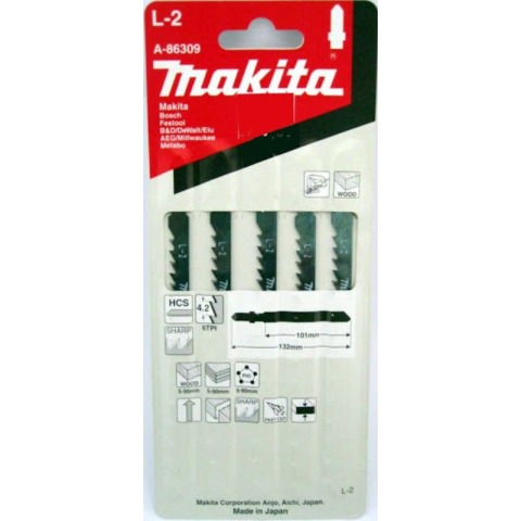 Makita 5db HCS L-2 szúrófűrészlap FA, gyors, TPI:6, L:132mm (A-86309) Jellemzők: - Szénacél (HCS) fűrészlap. - C fogtípus: Köszörült, hajtogatott fogazás Ajánlott felhasználás: Gyors vágás fában (
