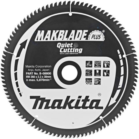 Makita Makblade Plus körfűrésztárcsa 260x30mm Z100 (B-08800) Makblade Plus tárcsák gérvágó fűrészekhez Az gérvágó fűrészekhez készített Makblade Plus tárcsák egyedi szabadalmai:Rezgés és vibráció csillapítást az egyedi kötésű, lézerrel vágott