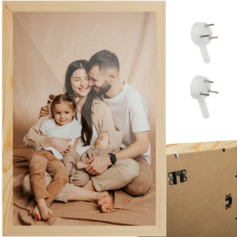 Sérülésálló, szinte törhetetlen plexi üveg biztonságos és hosszú élettartamot biztosít. A műanyag üveget mindkét oldalon matricák védik, amelyeket a fotó behelyezése előtt el kell távolítani. Maga a keret természetes fenyőfából készült. A keret hátulja 2 mm vastag HDF lappal van ellátva.