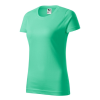 Single Jersey, 100 % pamut (szín esetében az anyagösszetétel eltérő lehet - 03 - 97 % pamut, 3 % viszkóz, 12 – 85 % pamut és 15 % viszkóz), szilikonos kezelés íves szabású, oldalvarrással 1:1 bordás kötésű keskeny nyakszegély 5 % elasztánnal hátsó nyak