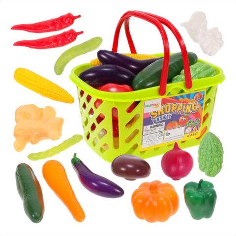 A kosár 20 darab különböző, élénk színű és részletgazdag műanyag zöldséget rejt – uborkát, padlizsánt, kukoricát, paradicsomot, gombát, céklát és még sok mást –, amelyekkel a gyerekek könnyedén eljátszhatják a bevásárlást, főzőcskét vagy akár egy saját ki