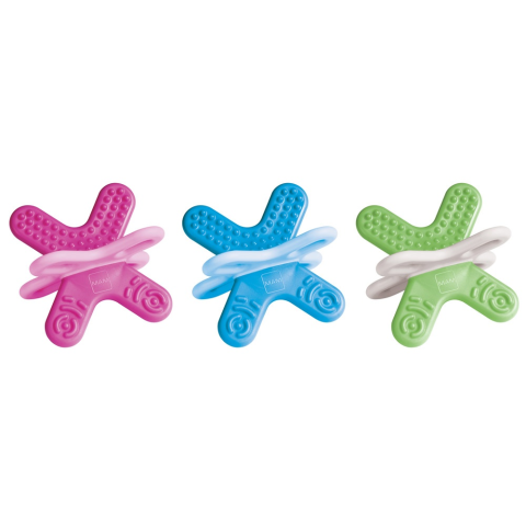 Rágóka A babák második fogzási időszakához tervezett mini rágóka kifejezetten a hátsó fogakhoz alkalmas. Az innovatív 3D-formájú, extra könnyű mini rágóka kiválóan alkalmas a babák finom-motoros készségeinek fejlesztésére. A 4 különböző felületi szerke