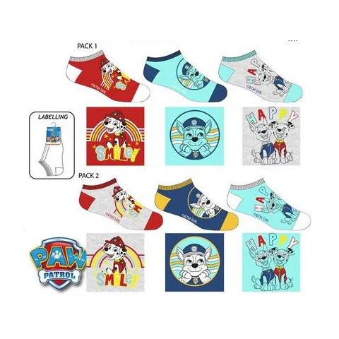 Mancs Őrjárat Paw Patrol Gyerek titokzokni 23-34 Anyaga: 55% Pamut, 25% Poliészter, 18% Poliamid, 2% Elastan Méretek: 23/26 27/30 31/34 Egy csomag 3 pár zoknit tartalmaz.