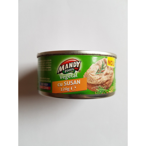 Mandy növényi pástétom szezámmagos 120 g Összetevők:víz,napraforgónövényiolaj,szójafehérje,búza keményítő,jódozottsó,szezámmag 4.2%,zselésítő anyag(karragén),stabilizátor(polifoszfátok),zeller,emulgeálószer(ecetsav észterei mono és digliceridekkel),sűr