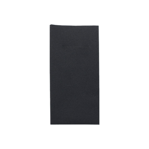 Fekete evőeszköz-zseb MANK BASIC a Linclass-Premium luxus anyagból. Méretei: 400 x 400 mm. A csomag 300 db-ot tartalmaz, 1/8 hajtással. Ideális kiegészítő az asztalterítéshez.