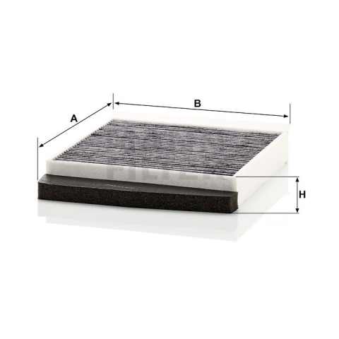 - Hossz 278 mm, Szélesség 219 mm, Magasság 30 mm, aktívszén szűrő
