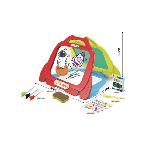 Többfunkciós rajztábla kis alkotóknak!Ezzel a 4 az 1-ben rajztáblával a gyerekek akár órákon keresztül alkothatnak kedvükre. A 3 oldalú rajtábla egyik oldala fluoreszkál, így a gyerekek a dobozban rejlő fluoreszkáló szövegkiemelővel rajzolhatnak rá szebbnél szebb képeket; másik oldala krétás táblaként vagy fehértáblaként funkcionál, amelyre a mellékelt krétákkal és filctollakkal rajzolhatnak a lurkók, harmadik oldala pedig átlátszó.A csomag mágneses betű