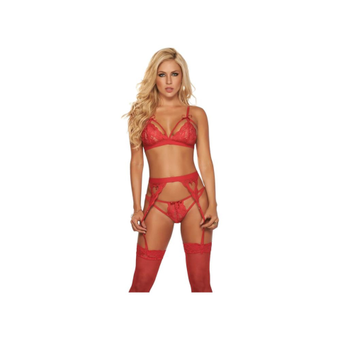 Vadító vörös színben készült csipke melltartó és bugyi a hozzá tartozó harisnyatartóval