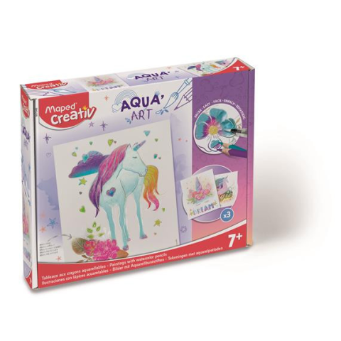 Akvarell festőkészlet, unikornis, MAPED CREATIV Aqua Art Fantasztikus akvarell festőkészlet kezdő művészpalántáknak. Aa játék fejleszti a fantáziát, a kreativitást, a figyelmet és a finommotorikát. A technika könnyen elsajátítható, így a sikerélmény ga