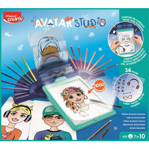 A Kreatív rajzkészlet kiegészítőkkel, MAPED CREATIV Avatar Studio (IMAC907064) Avatar készítő rajzkészlet, mellyel a lehetőségek végtelen tárháza tárul elénk. Az első rajzeszköz, egy világítós rajztábla, mellyel egyedi és mókás avatarok - virtuális kar