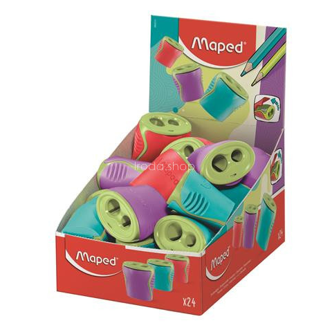 Hegyező display, kétlyukú, tartályos, MAPED Boogy, vegyes színek - műanyag test - kétlyukú, tartályos heygező - normál és vastag ceruzák hegyezésére alkalmas - fém pengével - dizájnos forma - vegyes színekben Gyártó/első EU forgalmazó elérhetősége: M