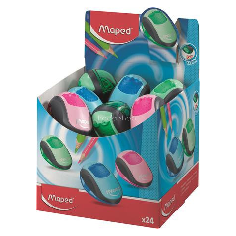 Hegyező display, kétlyukú, tartályos, MAPED Clean, vegyes színek - műanyag test - fém pengével - kétlyukú, két különböző ceruzavastagsághoz is használható - a lyukat takaró lemez a hegyezés befejeztével automatikusan visszazáródik, nem engedi kihull