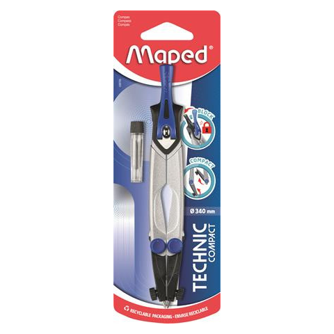 Körző, heggyel, MAPED Technic Compact - 2 mm-es grafitheggyel - fém lábakkal - ergonomikus nyéllel - egyszerűen és biztosan rögzíthető lábtávolság - a lábak felhajthatók, így biztonságosan elhelyezhetők tolltartóban és táskában Gyártó/első EU forg