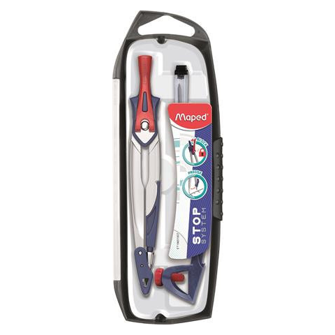 Körző készlet, rögzíthető lábakkal, 3 darabos, MAPED Stop System - fém lábakkal - 2 mm-es grafitheggyel - egyszerűen és biztosan rögzíthető lábtávolság - tű- és grafithegytakaró szerkezet védi a gyermekeket és a hegyet a sérülésektől - általános és