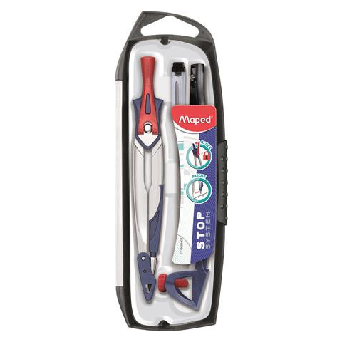 Körző készlet, rögzíthető lábakkal, 5 darabos, MAPED Stop System - fém lábakkal - 2 mm-es grafitheggyel - egyszerűen és biztosan rögzíthető lábtávolság - tű- és grafithegytakaró szerkezet védi a gyermekeket és a hegyet a sérülésektől - általános és