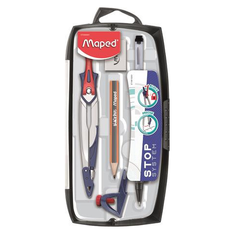 Körző készlet, rögzíthető lábakkal, 7 darabos, MAPED Stop System - fém lábakkal - 2 mm-es grafitheggyel - egyszerűen és biztosan rögzíthető lábtávolság - tű- és grafithegytakaró szerkezet védi a gyermekeket és a hegyet a sérülésektől - általános és